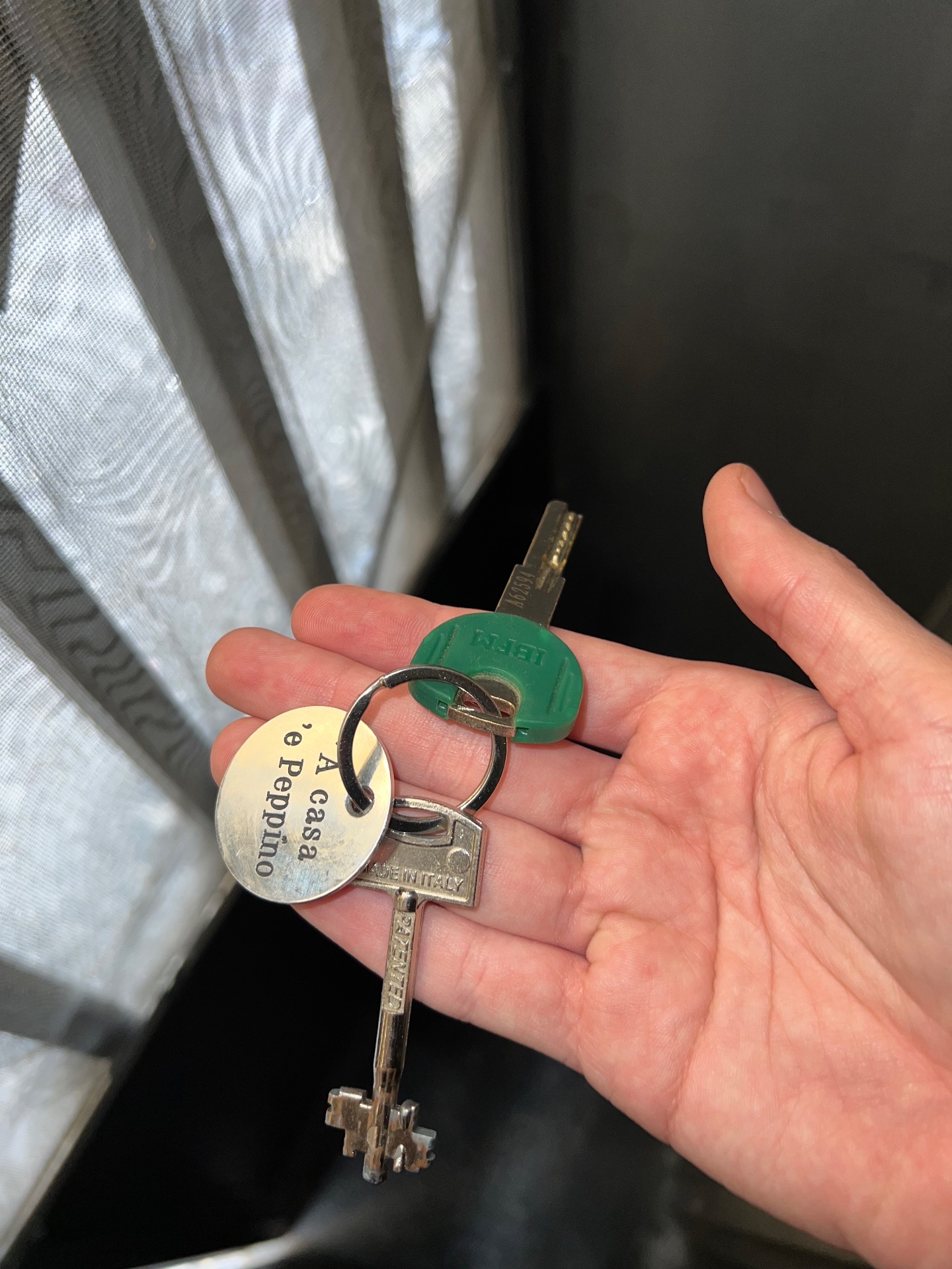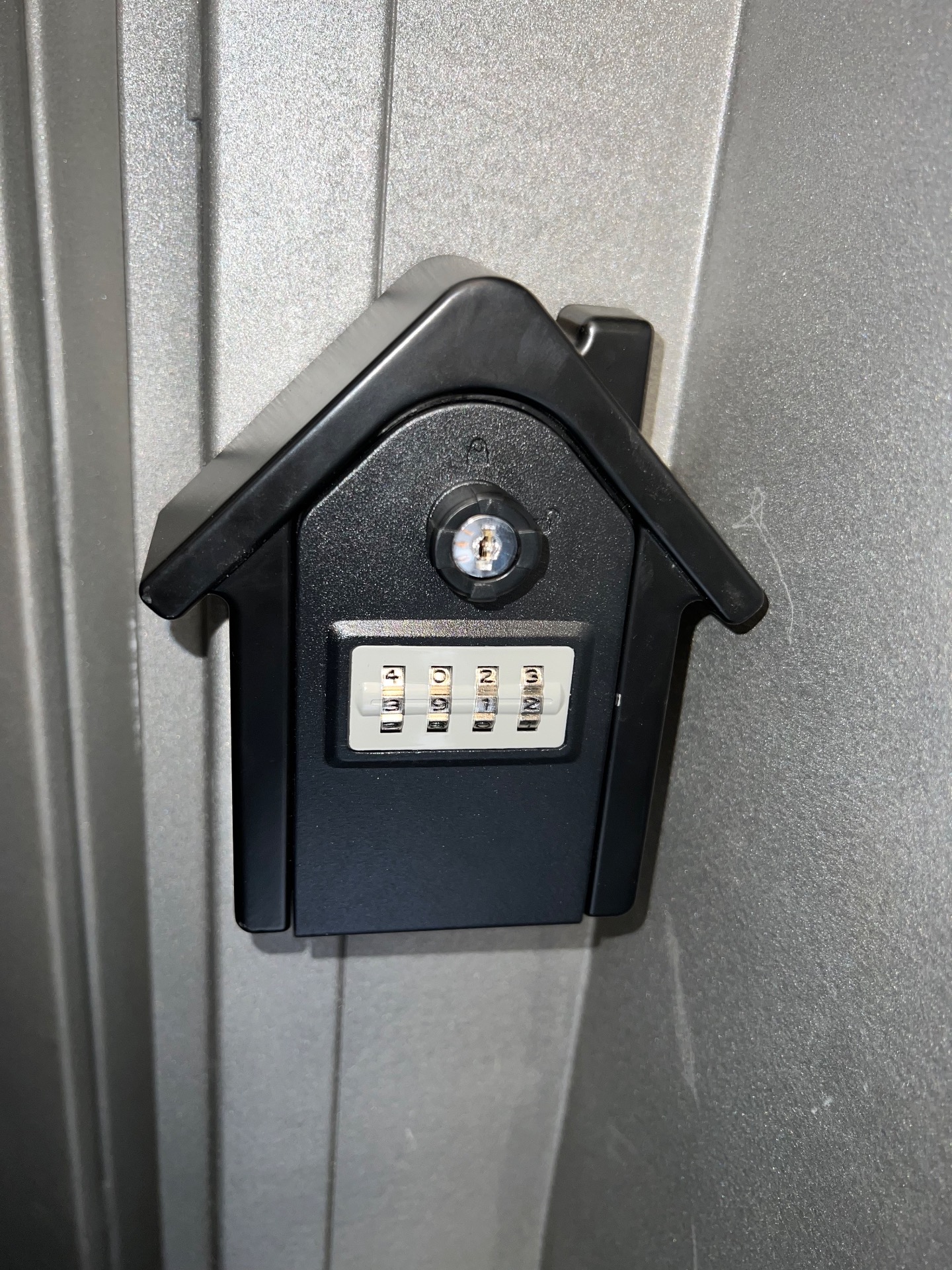 You will find the keys inside the box. The green one is for the inside door, while the other one is for the outside gate.