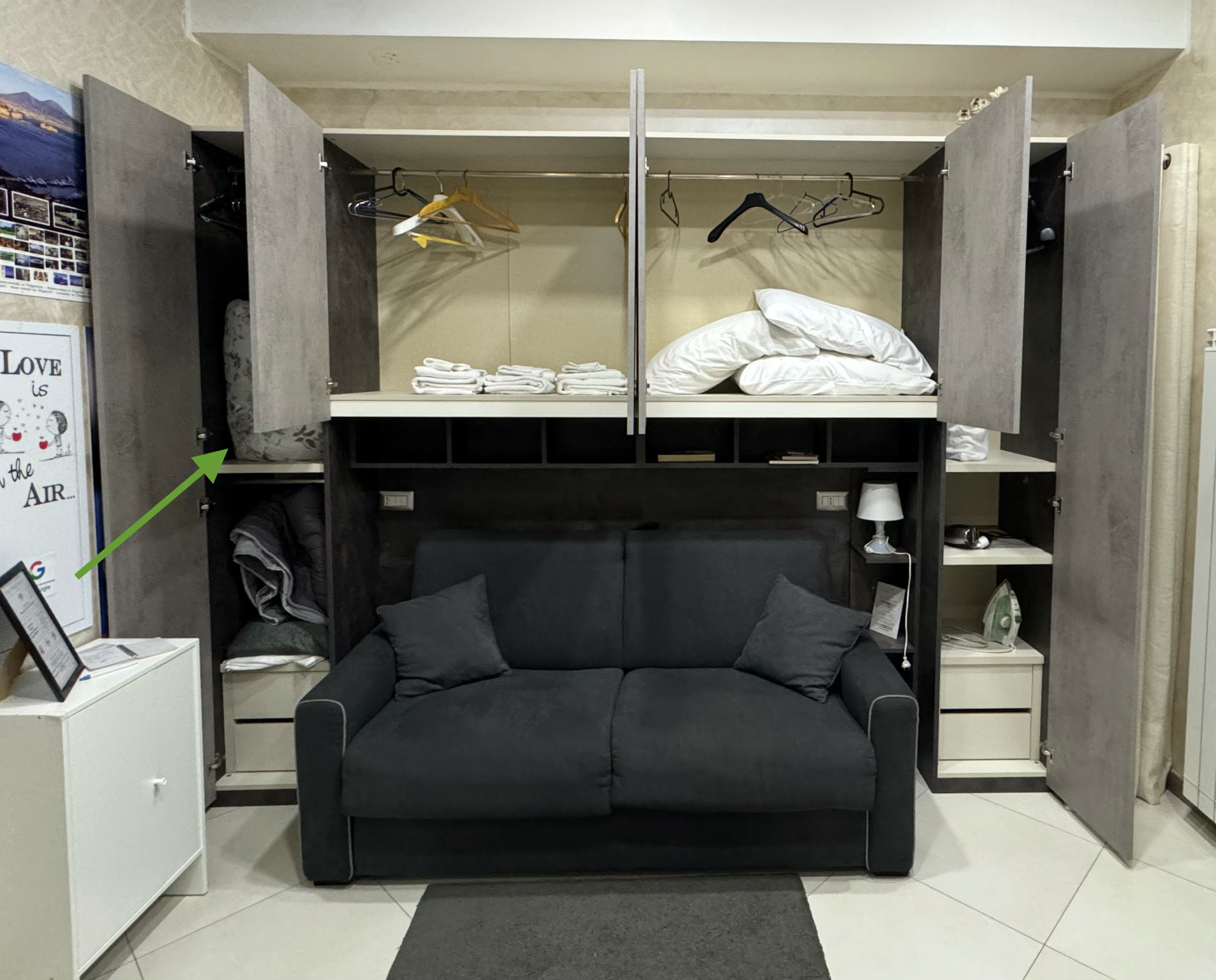 The main bed is in the sofa itself; you can open it by pulling it from the back.