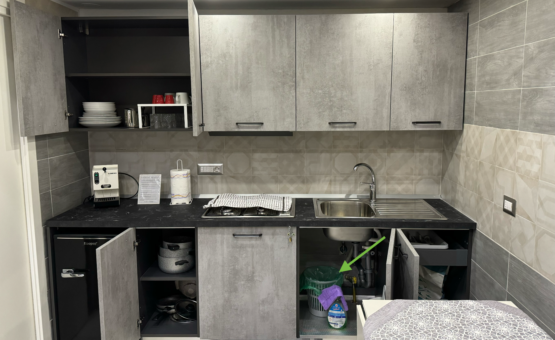 In the upper part of the kitchen are plates, cups and glasses. On the lower left side you can find pots and pans should you wish to cook, while on the right side, indicated by the green arrow, is the garbage.
